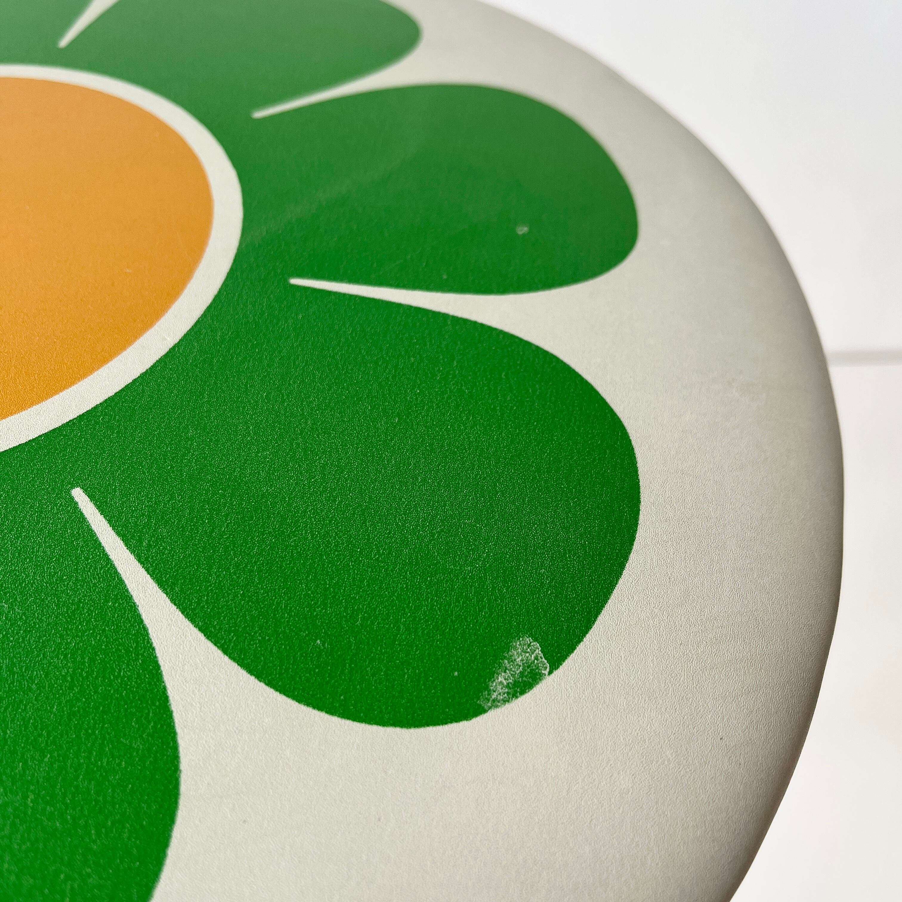グリーンとオレンジの組み合わせがレトロポップな花柄がかわいいスツールです。
