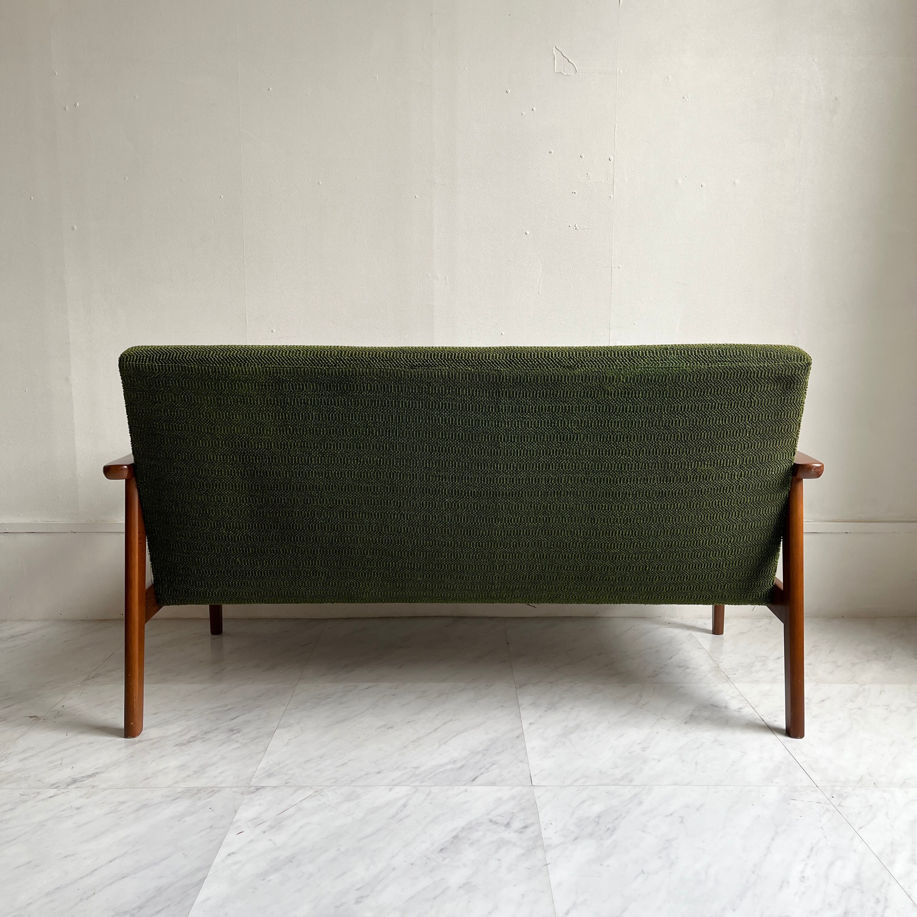 希少なオールドカリモクのツーシーターです。当時のオリジナルの、凹凸のあるグリーンのファブリックです。写真では分かりづらいですが、現在のグリーンモケットに近い色です。
