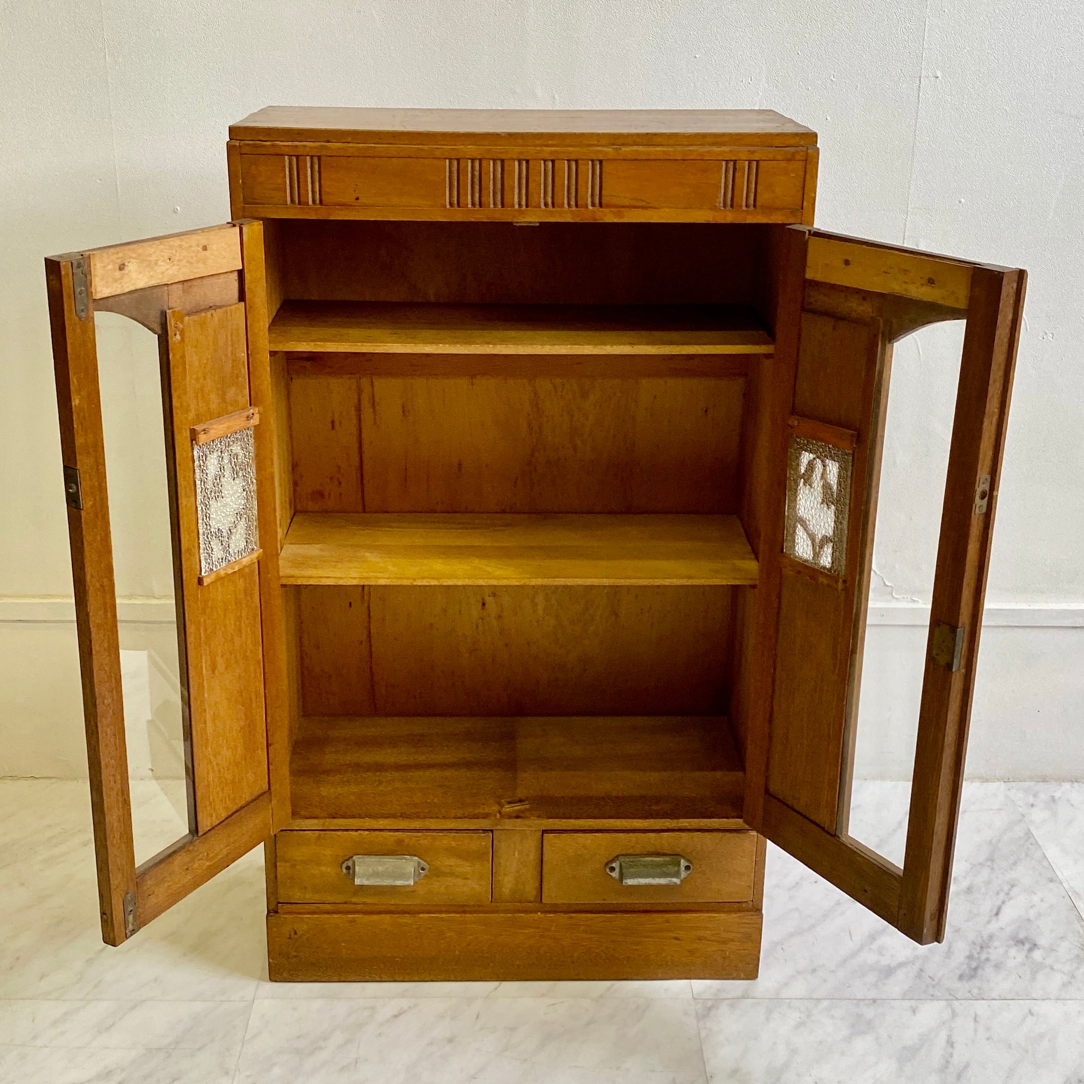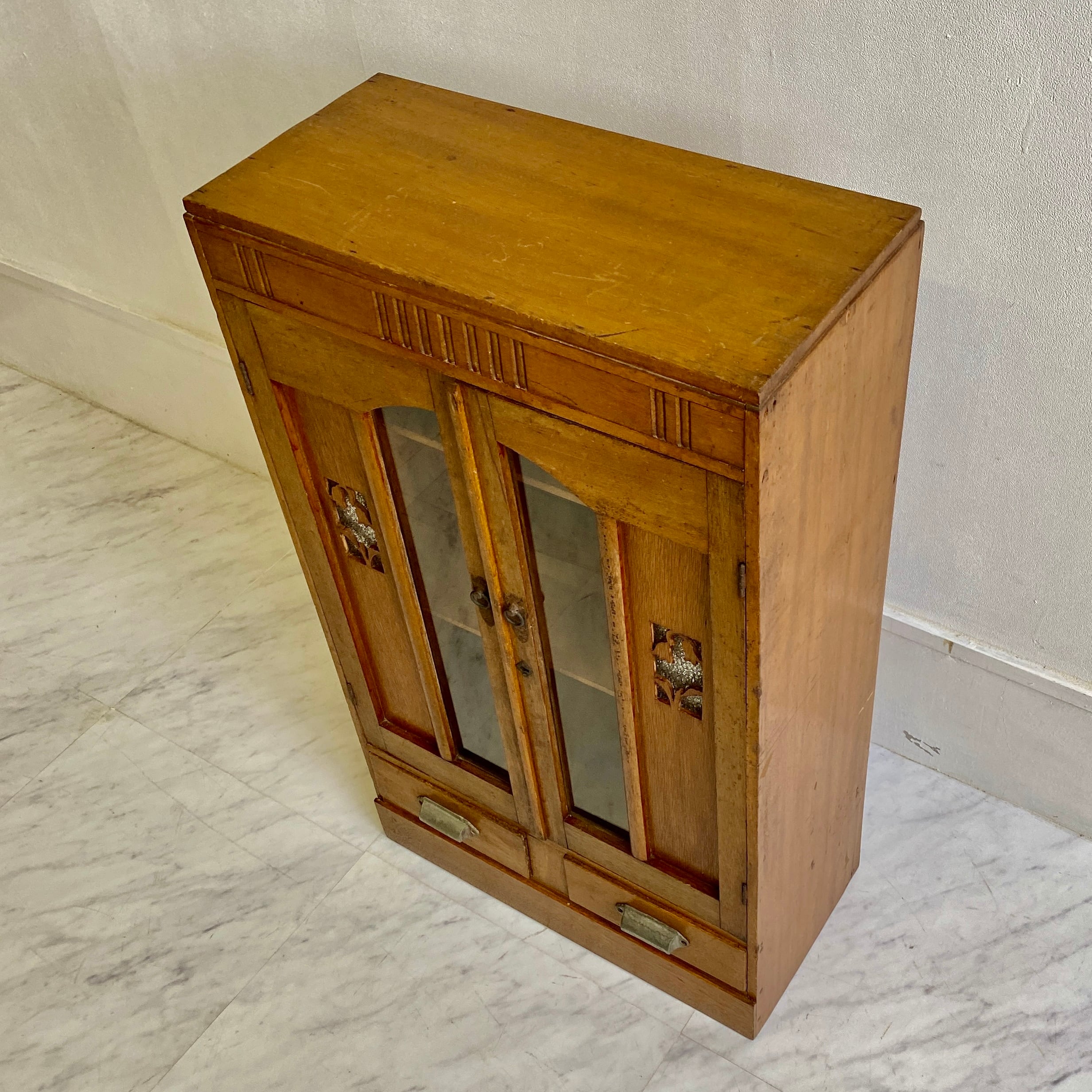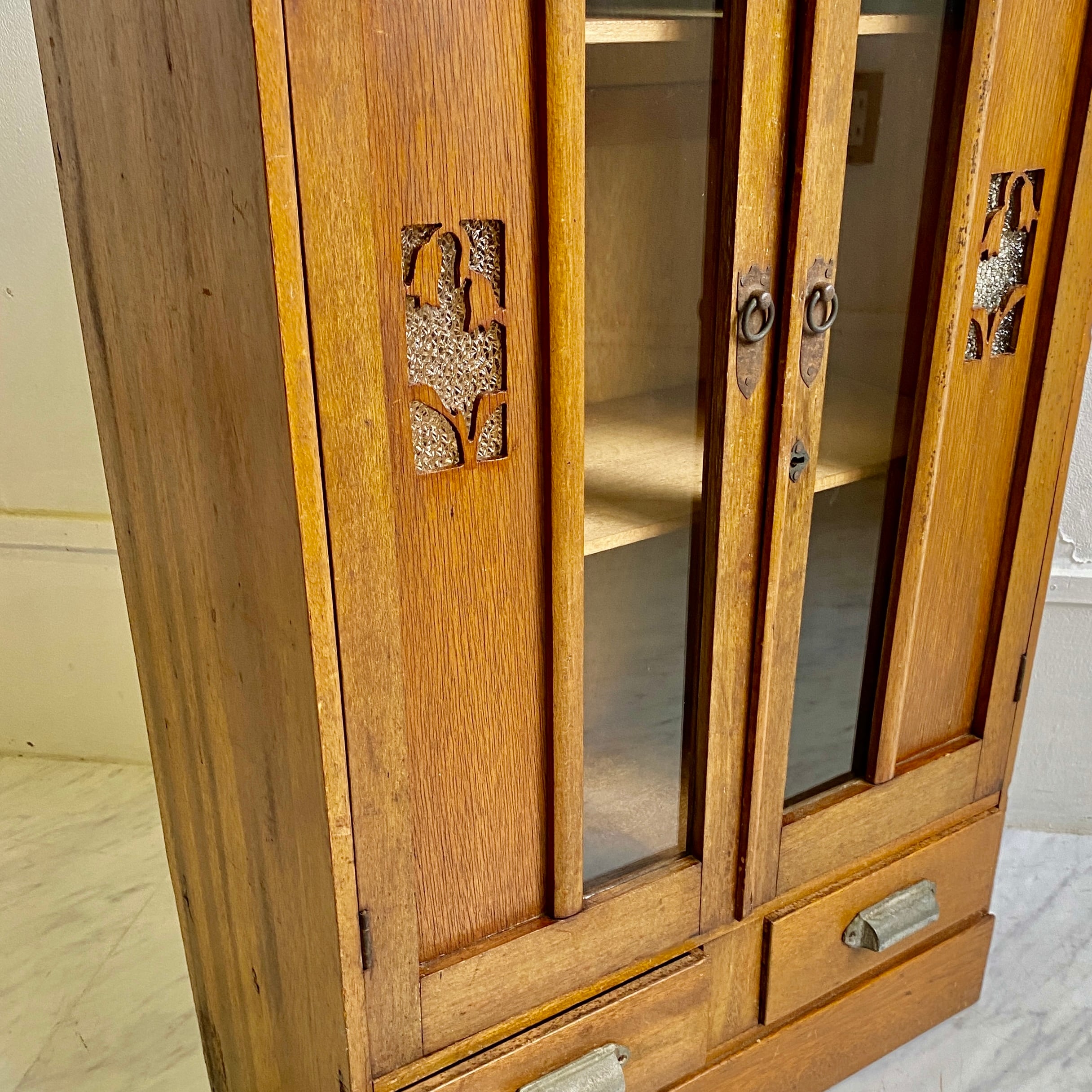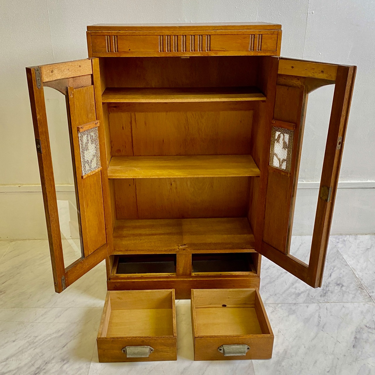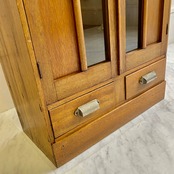 昭和レトロ 小振りなガラス扉付き両開きの棚 本棚 引出し 飾り棚 コレクションケース 棚 店舗什器 古道具 レトロ アンティーク 中古